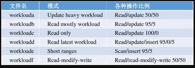 - workloads目录下 :里面包含一些压力测试的场景文件。YCSB自带了6中压力测试场景,文件和相应场景的对应关系如下: