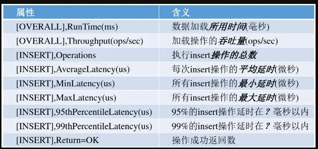 - -p用来设置一些参数,比如数据库的ip和port。测试完成后,YCSB会打印平均/最小/最大延迟等信息。