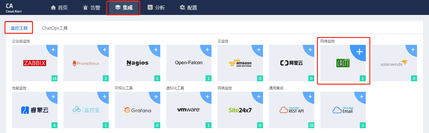 2.在Cloud Alert中创建Cacti应用,点击集成—监控工具—Cacti