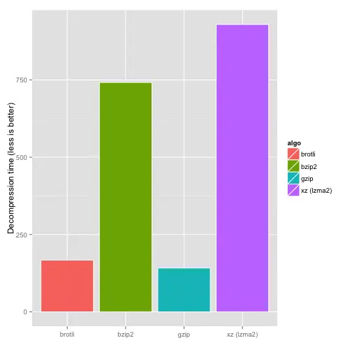 从上面三幅图我们可以看出:相比于 gzip、xz 和 bz2,brotli 有最高的压缩比,接近于 gzip 的解压速度,以及最慢的压缩速度。