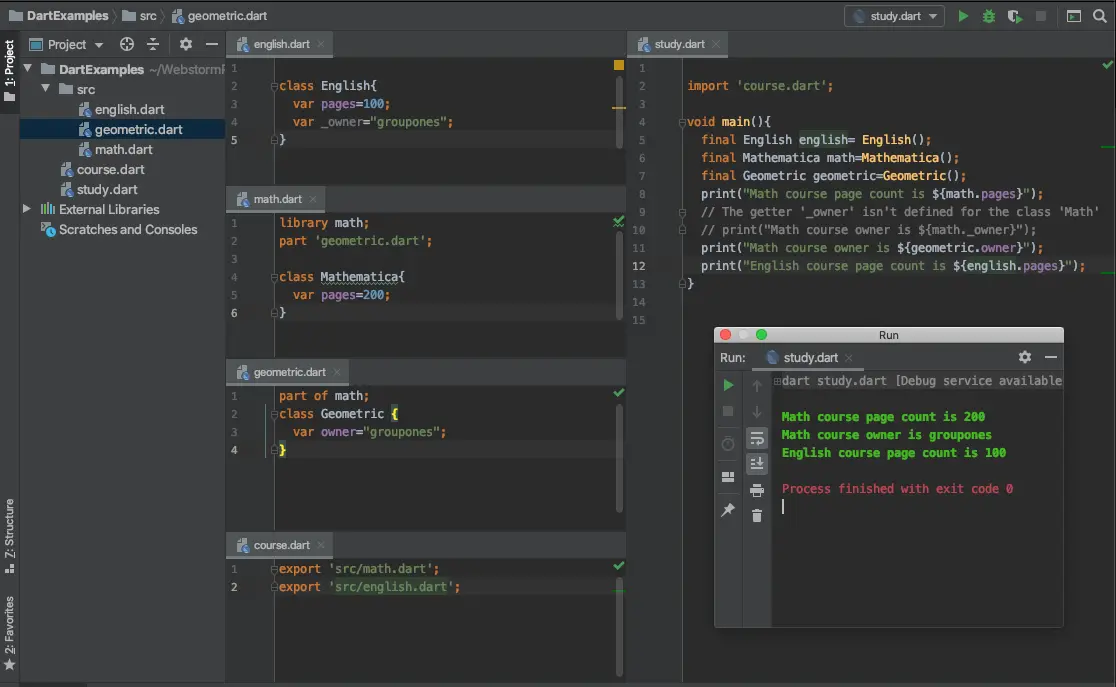 下图示例演示了import,library,export,part的基本用法,请留意这几个文件的位置组织结构。