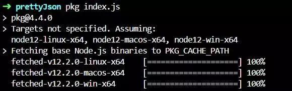 下面,我们要祭出pkg了。在使用之前,请安装好所有相关依赖。我们指定好入口文件就可以进行编译了:pkg index.js。默认地,pkg会选择下载最新的NodeJS源码,并编译三个主流的平台,以笔者这里的情况是:node12-linux-x64, node12-macos-x64, node12-win-x64。