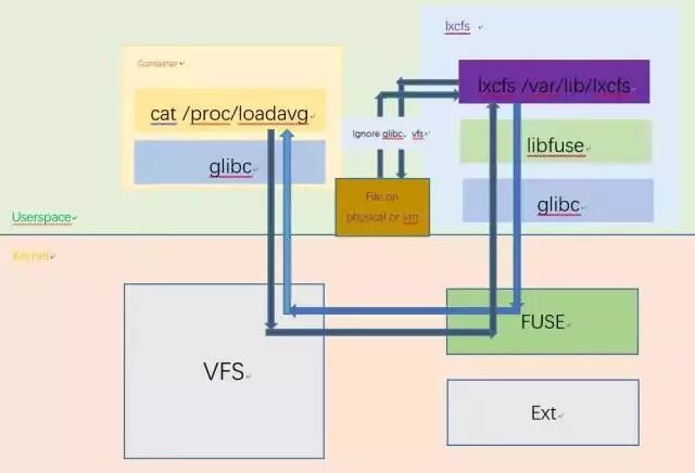 const struct fuse_operations lxcfs_ops = {...... .open = lxcfs_open, .read = lxcfs_read, .release = lxcfs_release, .write = lxcfs_write,......}static int lxcfs_read(const char *path, char *buf, size_t size, off_t offset, struct fuse_file_info *fi){ int ret; if (strncmp(path, "/cgroup", 7) == 0) { up_users(); ret = do_cg_read(path, buf, size, offset, fi); down_users(); return ret; } if (strncmp(path, "/proc", 5) == 0) { up_users(); ret = do_proc_read(path, buf, size, offset, fi); down_users(); return ret; } if (strncmp(path, "/sys", 4) == 0) { up_users(); ret = do_sys_read(path, buf, size, offset, fi); down_users(); return ret; } return -EINVAL;}static int do_sys_read(const char *path, char *buf, size_t size, off_t offset, struct fuse_file_info *fi){ int (*sys_read)(const char *path, char *buf, size_t size, off_t offset, struct fuse_file_info *fi); char *error; dlerror(); /* Clear any existing error */ sys_read = (int (*)(const char *, char *, size_t, off_t, struct fuse_file_info *)) dlsym(dlopen_handle, "sys_read"); error = dlerror(); if (error != NULL) { lxcfs_error("%s\n", error); return -1; } return sys_read(path, buf, size, offset, fi);}