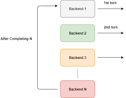 如图所示,请求周期性的轮流转发给后端服务。但是我们不能直接这样简单来实现,需要考虑其他因素。