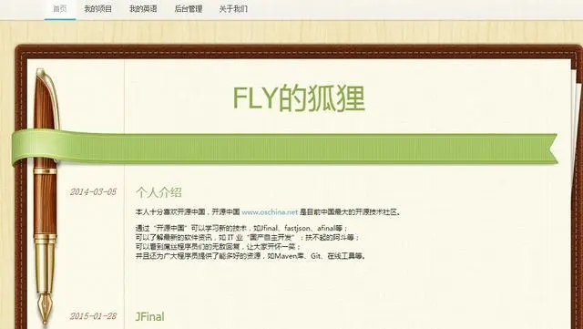 项目简介:Jflyfox 是一个 Java 开发的功能强大的博客系统,采用了简洁强大的 JFinal 作为 web 框架,模板引擎用的是 beetl,数据库用 mysql,前端 bootstrap 框架。 支持 oauth2 认证、帐号注册、密码加密、评论及回复,消息提示,网站访问量统计,文章评论数和浏览量统计,回复管理,支持权限管理。
