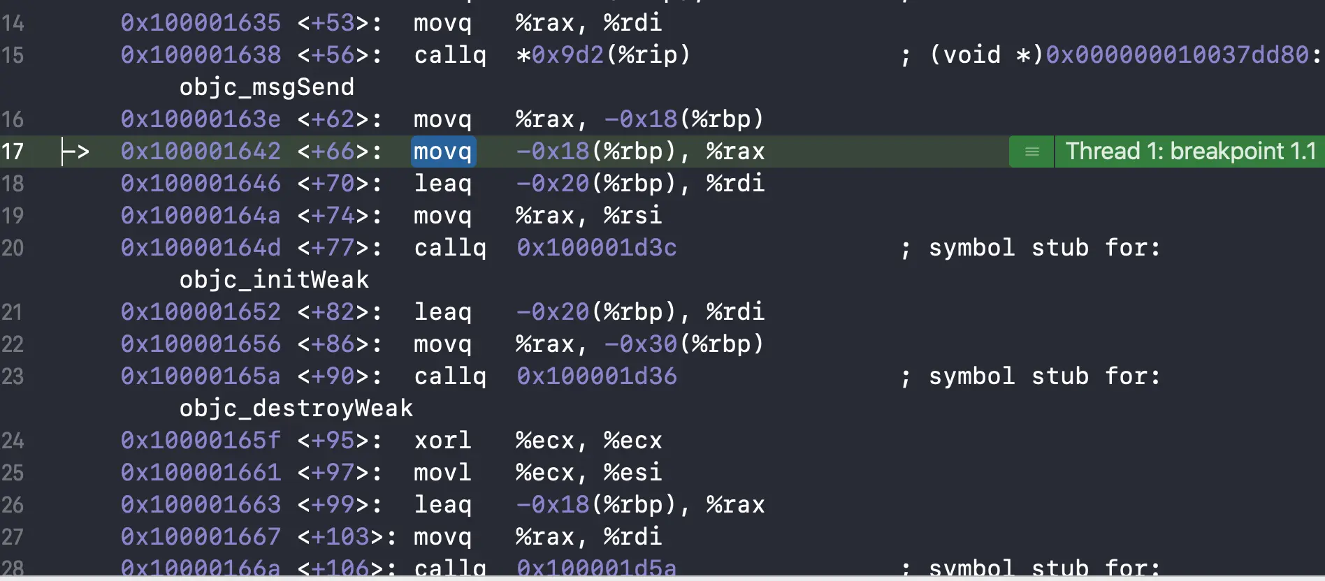 然后我们设置一个符号断点,objc_initWeak,会进入以下代码: