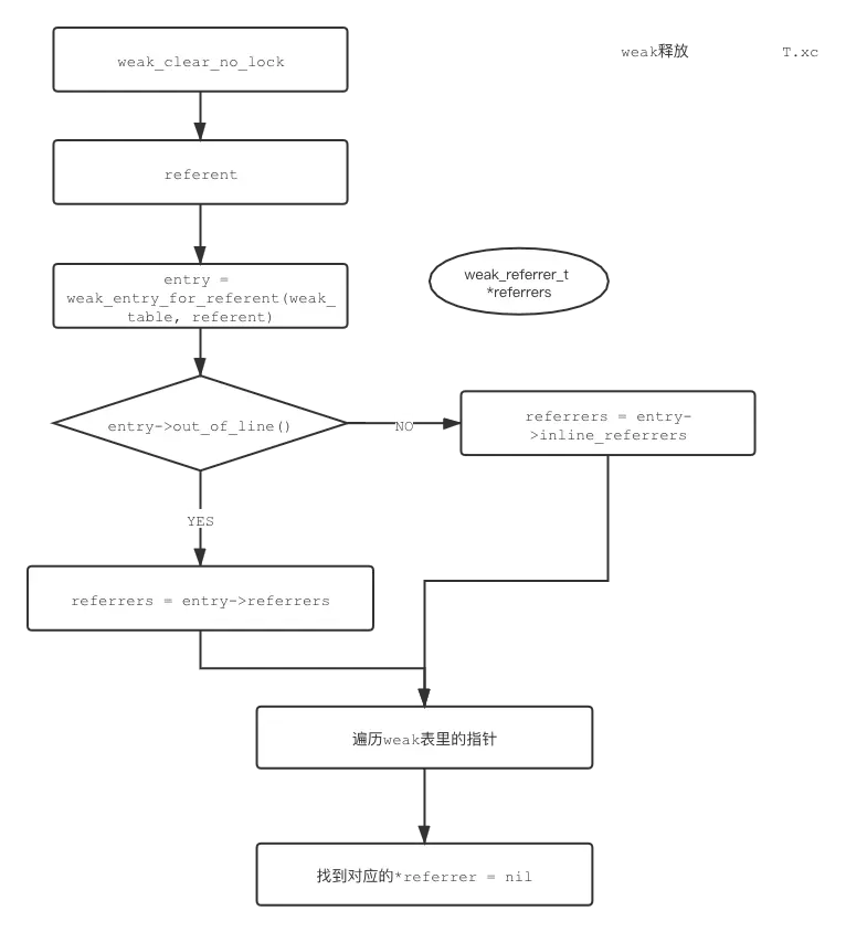 weak_entry_t的referrers里面查找,找到就将对应的引用指针地址置为nil - 找不到就在