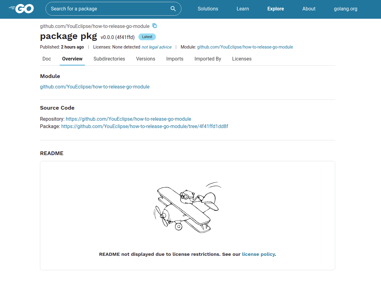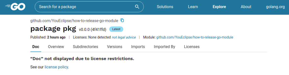 “Doc” not displayed due to license restrictions.和README not displayed due to license restrictions,是说我们的包没有开源许可证,所以无法显示。对于这一点,网上有资料提到go官方团队和他们的律师讨论过才做的这个决定,这也是可以理解的。