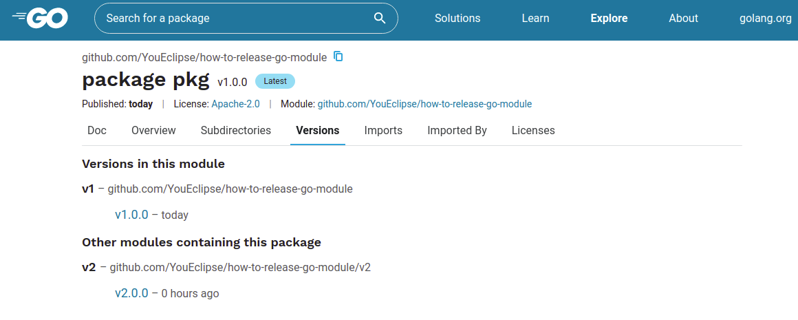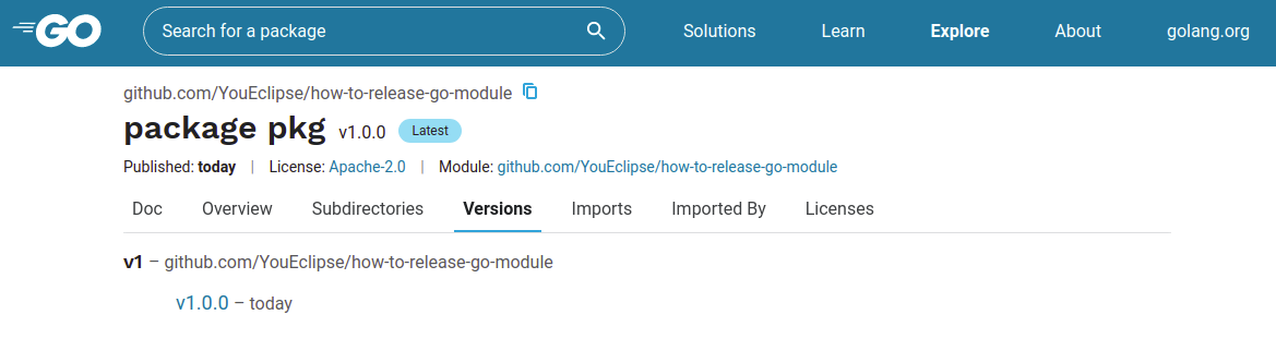 打上标签后push到远端分支,等待一段时间,我们就可以在pkg.go.dev上看到我们发布的v1.0.0版本了。