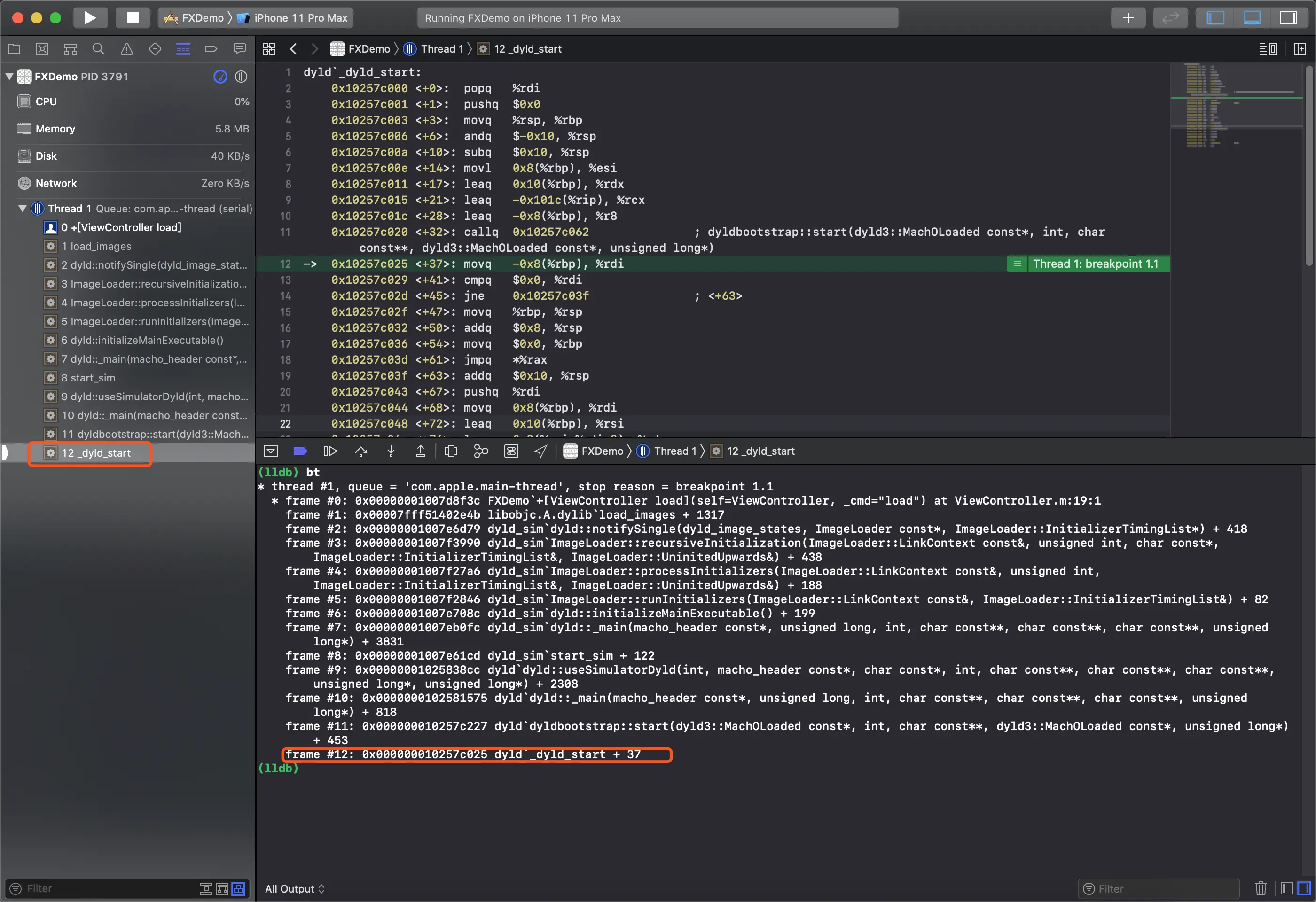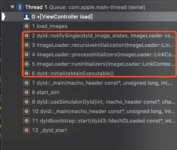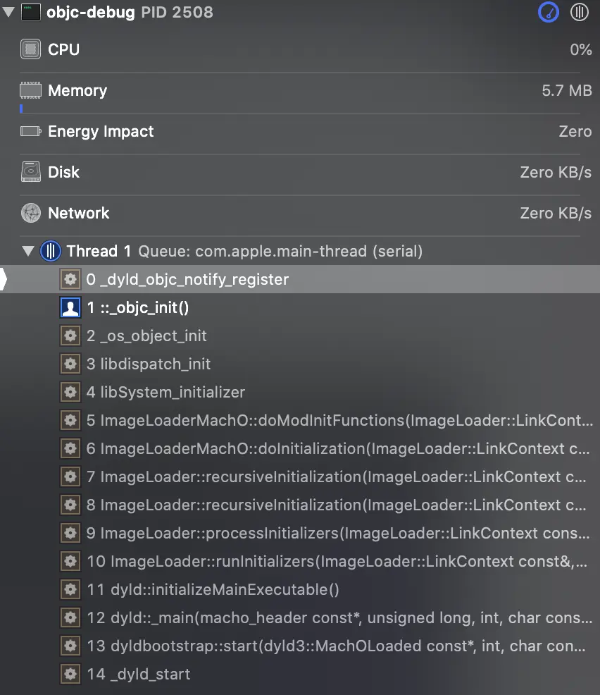 点击函数调用栈/使用LLVM——bt指令打印,都能看到最初的起点_dyld_start