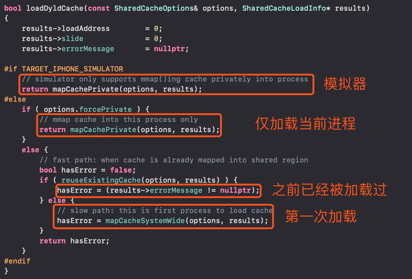 由于不止一个程序需要使用UIKit系统动态库,所以不可能在每个程序加载时都去加载所有的系统动态库。为了优化程序启动速度和利用动态库缓存,苹果从iOS3.1之后,将所有系统库(私有与公有)编译成一个大的缓存文件,这就是dyld_shared_cache,该缓存文件存在iOS系统下的/System/Library/Caches/com.apple.dyld/目录下