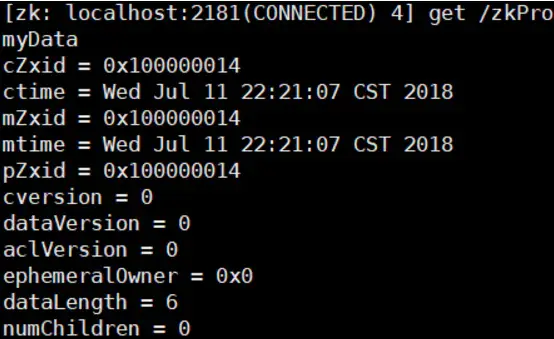 4、下面我们运行 get 命令来确认第二步中所创建的 znode 是否包含我们所创建的字符串: