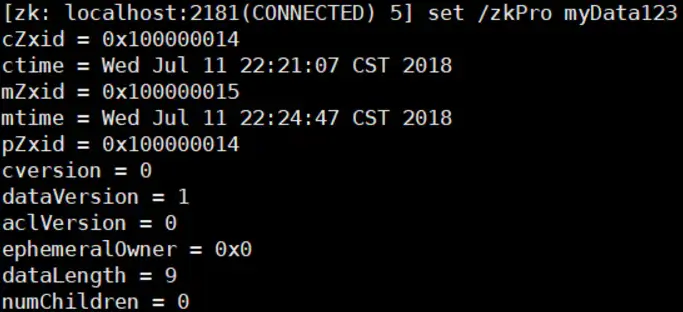 5、下面我们通过 set 命令来对 zk 所关联的字符串进行设置: