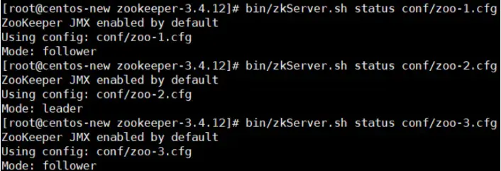 Step7:检测集群状态,也可以直接用命令“zkCli.sh -server IP:PORT”连接zookeeper服务端检测