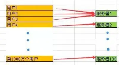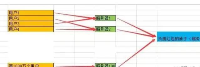 那这样的话,平均到每一秒上的请求也就不到1千个,这种压力一般的服务器还是可以承受的。第一个用户来分,请求到来后,需要在1亿里面给他分一部分钱,金额随机,假设第一个人分到了100,那就要在这1亿中减去100块,剩下99999900块。第二个用户再来分,金额随机,这次分200块,那就需要在剩下的99999900块中再减去200块,剩下99999700块。等到第10w个用户来,一看还有1000w,那这1000w全成他的了。等于是在每个服务器中去分1亿,也就是10w个用户分了一个亿,最后总计有100个服务器,要分100亿。如果真这样了,虽说马云爸爸不会破产(据最新统计马云有2300亿人民币),那分红包的开发项目组,以及产品经理,可以GG了。简化结构图如下:
