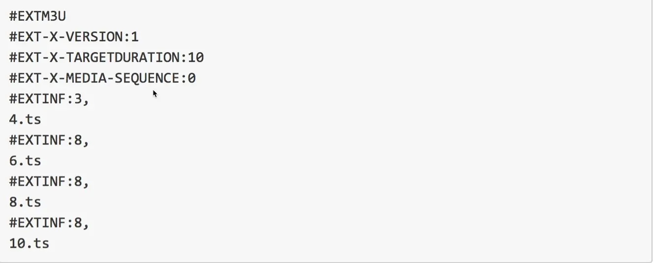基于 HLS 的直播流 URL 是一个 m3u8 的文件,里面包含了最近若干个小视频 TS(一种视频封装格式,这里就不扩展介绍)文件。如 http://ip:port/live.m3u8 是一个直播留链接,其内容如下: