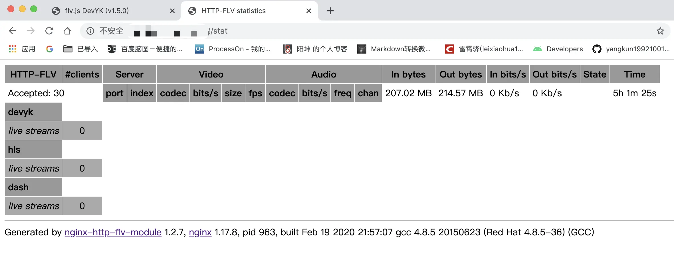 本来之前我是借助 nginx-rtmp-module 来搭建的直播服务器(已成功),奈何它好像不支持 Http-flv 协议,所以替换成了 nginx-http-flv-module 模块,它是基于 nginx-rtmp-module 模块二次开发的,所以完美的继承了 rtmp 模块的所有功能。