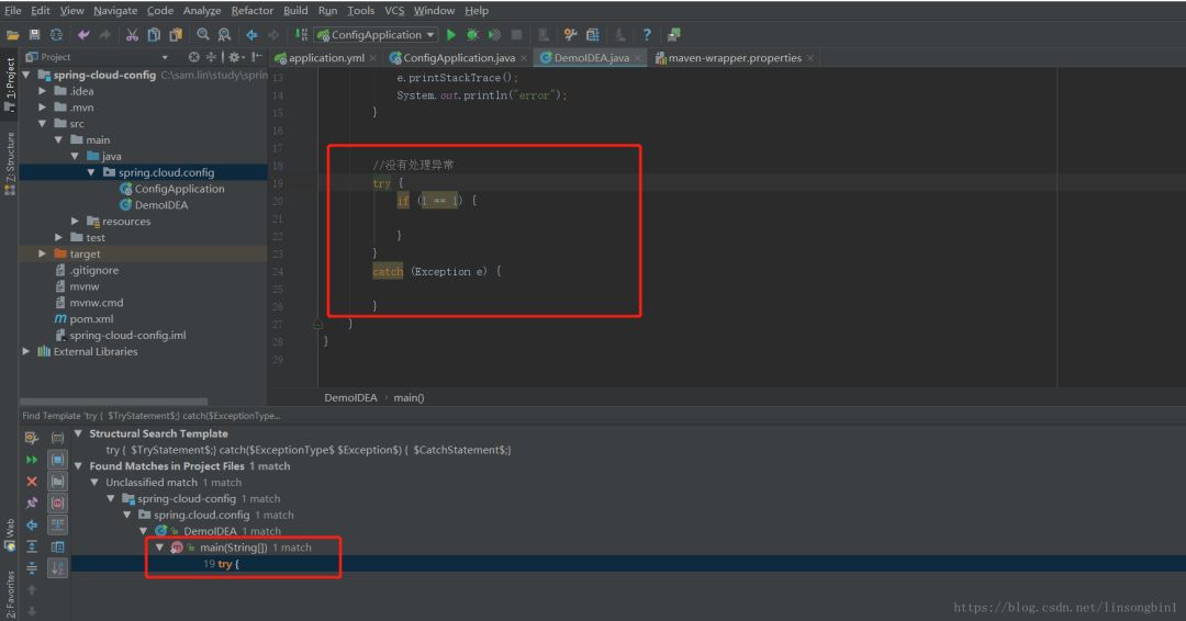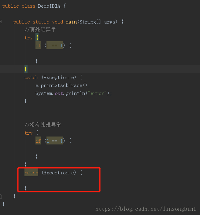 想在整个工程里面找到所有的try catch语句,但是catch语句里面没有做异常处理的。
