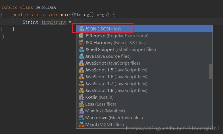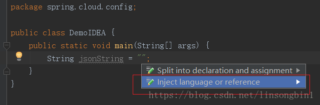 先将焦点定位到双引号里面,使用alt+enter快捷键弹出inject language视图,并选中Inject language or reference。