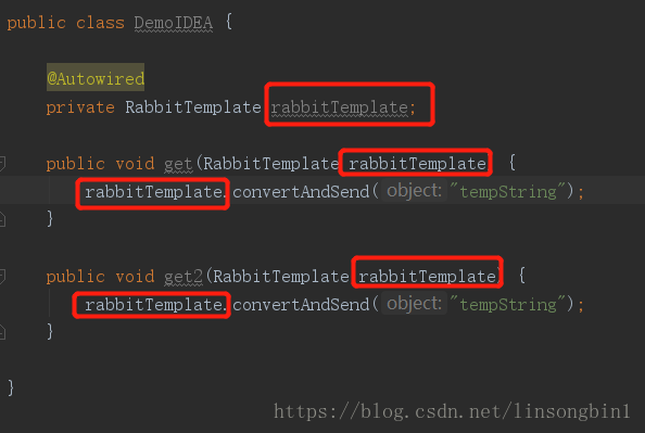 上面的代码中,有5个地方用到了rabbitTemplate文本,如何批量修改呢? 首先是使用ctrl+w选中rabbitTemplate这个文本,然后依次使用5次alt+j快捷键,逐个选中,这样五个文本就都被选中并且高亮起来了,这个时候就可以直接批量修改了。