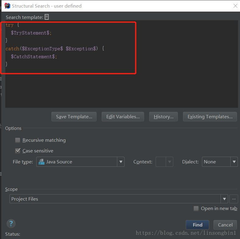 点击Existing Templates按钮,选择try模板。为了能找出catch里面没有处理异常的代码块,我们需要配置一下CatchStatement的Maximum count的值,将其设置为1。
