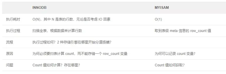 先来看一下概况,MySQL COUNT( * ) 在 2 种存储引擎中的部分问题: