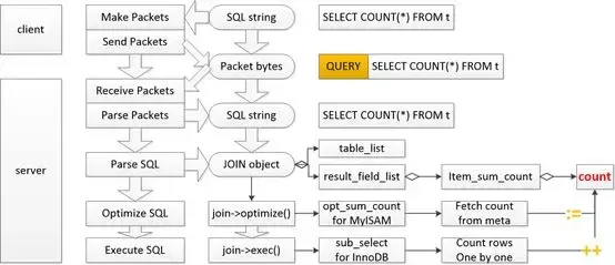 共性:共性存在于 SQL 层,即 SQL 解析之后的数据结构是一致的,count 变量都是存在于作为结果列的 Item_sum_count 类型对象中;返回给客户端的过程也类似 – 对该 count 变量进行赋值并经由 MySQL 通信协议返回给客户端。
