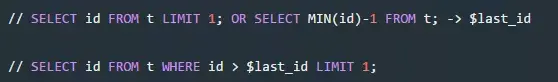 正如我们如果用脚本/程序来进行逐行的扫表操作,实现上就会涉及下面 2 个 SQL: