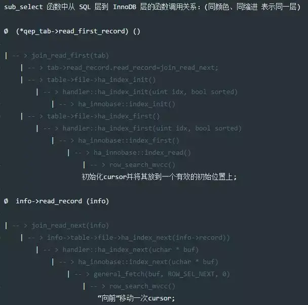 具体涉及到此例的代码,SQL 层到存储引擎层的调用关系,读取阶段的调用栈如下:(供参考)