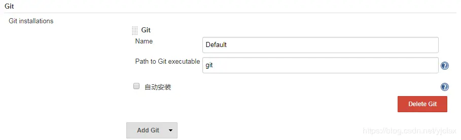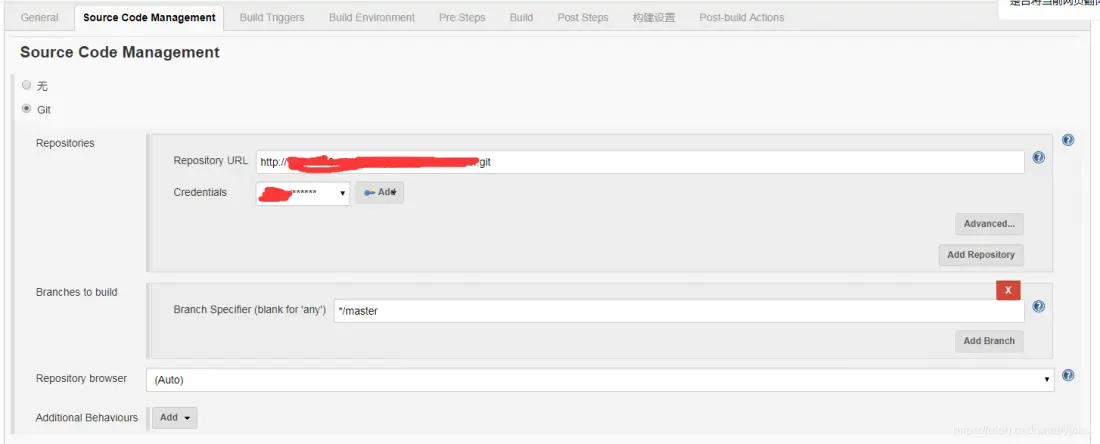 在源码管理中配置git地址和验证配置,点击add,然后在弹出框里添加用户名和密码。