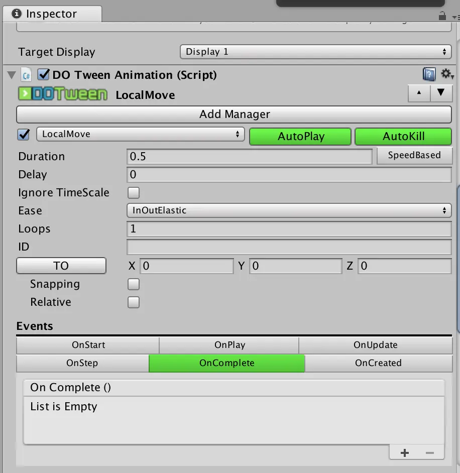 代码中加了onComplete事件之后,需要在Editor中,将DoTweenAnimation视图的Events属性里的OnComplete按钮点亮: