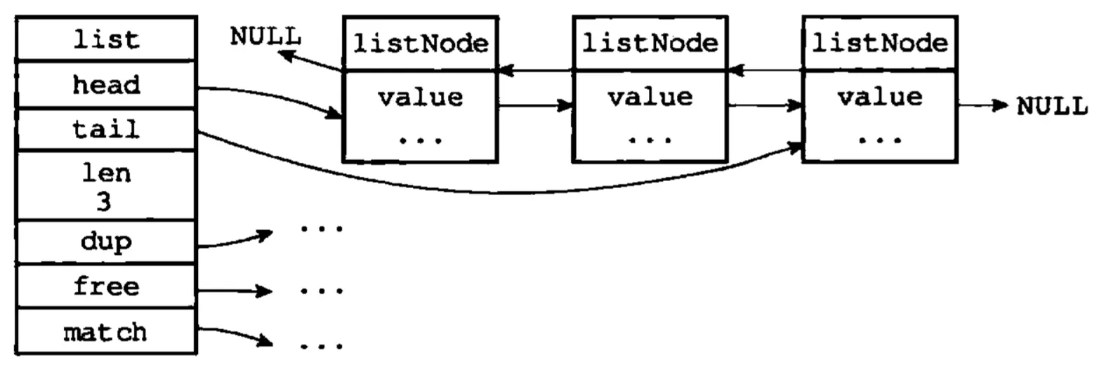 head为表头指针;tail为表尾指针;len为链表长度计数器;dup为函数指针,用于复制链表节点所保存的值;free为函数指针,用于释放链表节点所保存的值;match为函数指针,则用于对比链表节点所保存的值和另一个输入值是否相等。