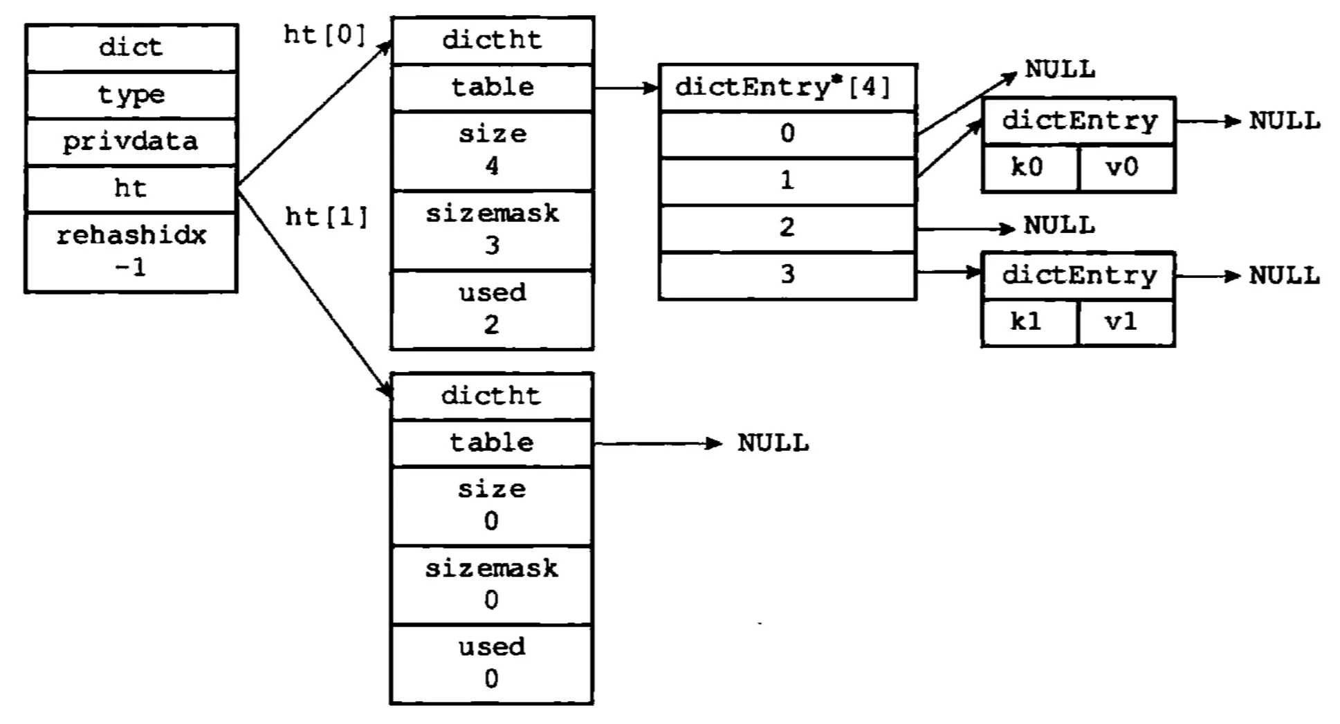 字典将键和值进行关联,当哈希键中的键值对数量比较多,或者键值对中的元素比较大的时候,采用字典作为底层实现。字节的数据结构如下