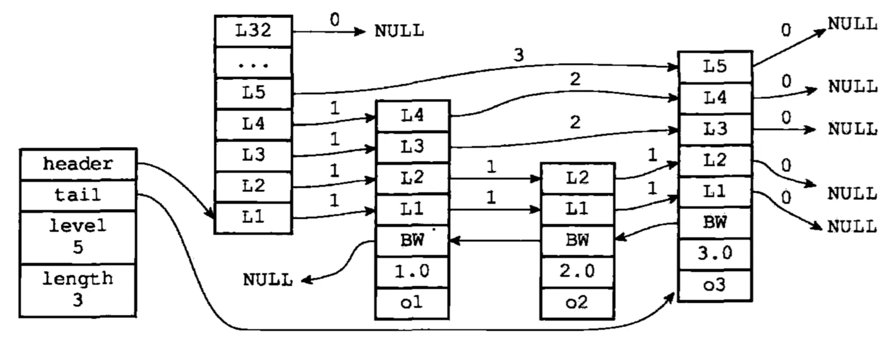 level) : 每个层都带有两个属性:前进指针和跨度。前进指针用于 访问位于表尾方向的其他节点,而跨度则记录了前进指针所指向节点和当前节点的 距离。 - 后退 (