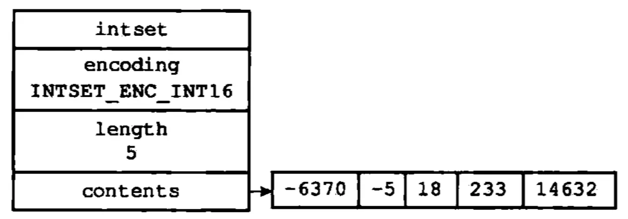 contents数组是整数集合的底层数据存放位置,各个项在数组中按值的大小从小到大有序地排列,并且数组中不包含任何重复项。length属性记录了整数集合包含的元素数量,encoding属性决定了整数类型(INTSET_ENC_INT16/INTSET_ENC_INT32/INTSET_ENC_INT64)。新元素的类型比整数集合现有所有元素的类型都要长时,整数集合需要先进行升级。