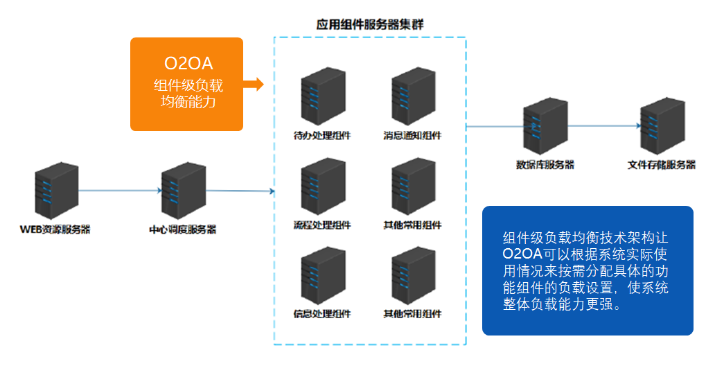 O2OA支持对单个组件进行负载均衡设置,可以将某一个使用量比较大,负载压力比较大的组件,分布到多个主机上提供服务。