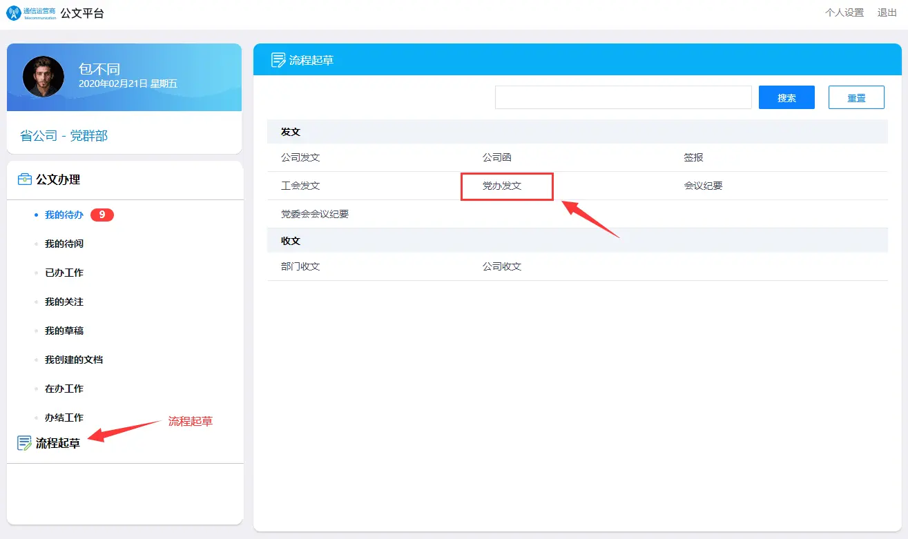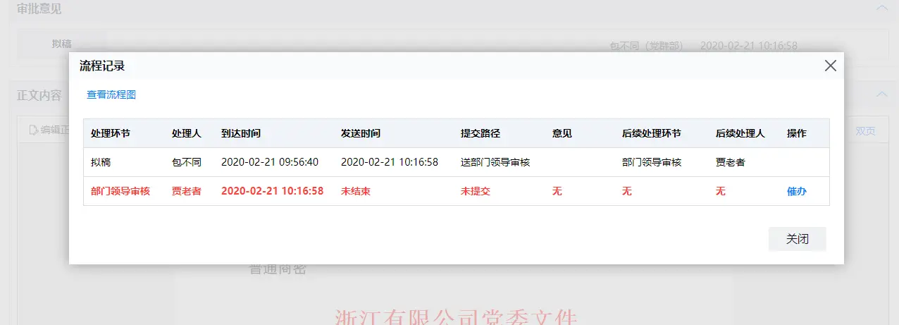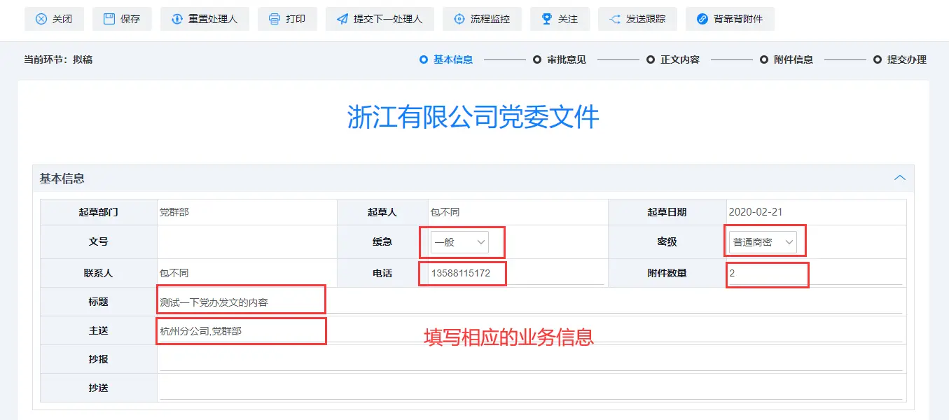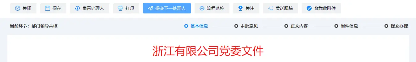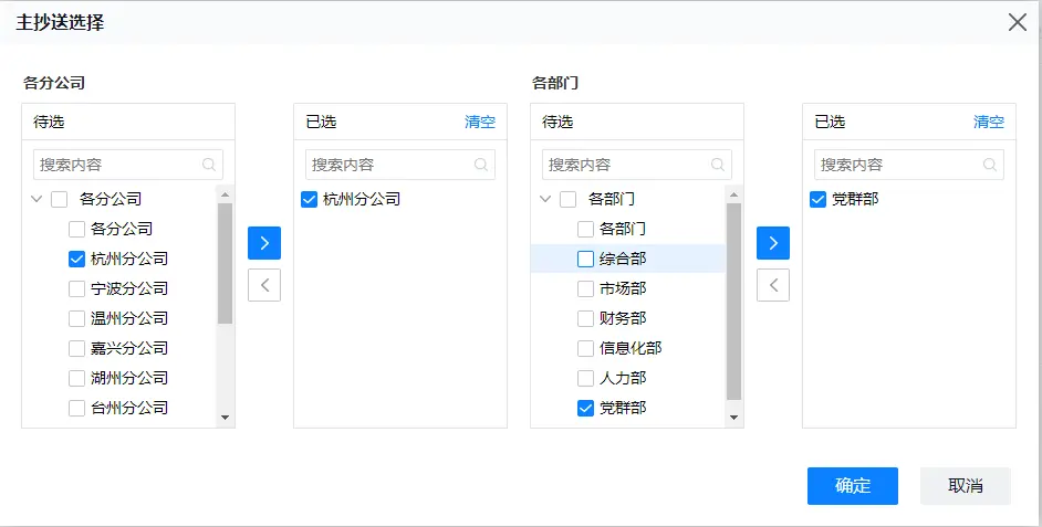点击主送后,在弹出的主送选择页面上选择相应的组织,如杭州分公司党群工作部: