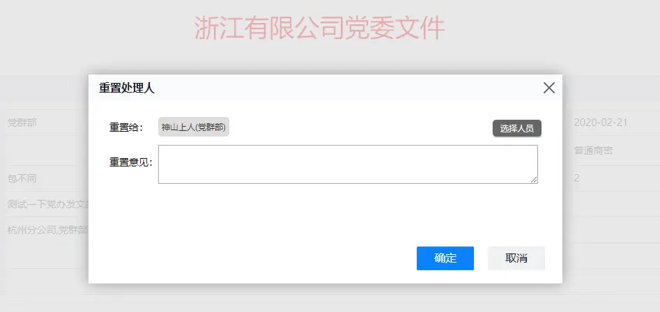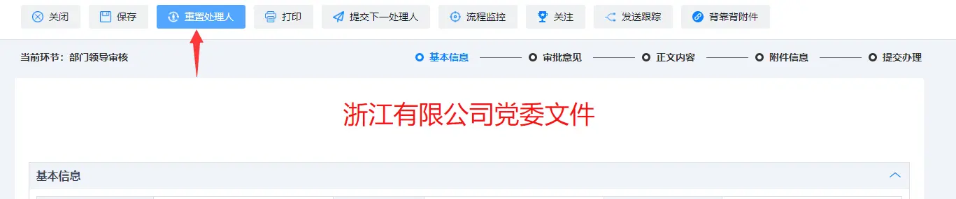 当待办人需要将当前的处理环节转交其他人进行处理时,可以使用重置处理人功能: