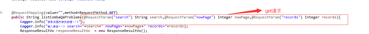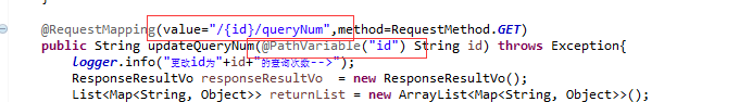 另外,还有一种应用场景,接口规范为resultful风格时,举个例子:如果要获取某个id下此条问题答案的查询次数的话,则后台就需要动态获取参数,其注解为@PathVariable,并且requestMapping中的value应为value="/{id}/queryNum",截图如下: