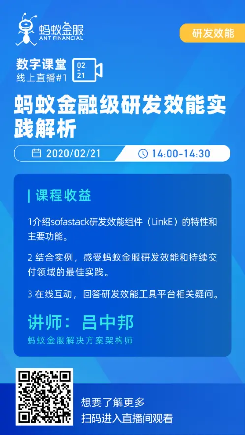 蚂蚁金服“共战‘疫情’,技术破局”数字课堂线火热直播中,2月21日14:00-14:30,蚂蚁金服解决方案架构师吕中邦将进行在线直播和答疑,分享如何基于sofastack研发效能平台,开展敏捷交付和稳妥创新兼顾的持续交付、风险防控和质量保障等最佳实践,赋能金融产品高可用和研发效能的持续提升。