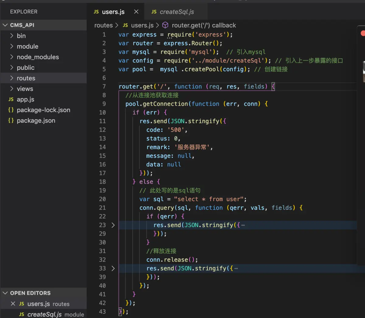 下图写一个例子,来测试接口,此sql语句用来获取数据库中的user表的数据,写完user.js中的代码的时候,npm start运行项目,在浏览器中打开:http://localhost:3000/users查看user表中的数据