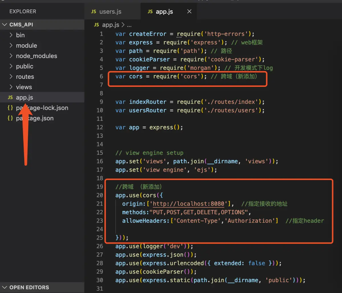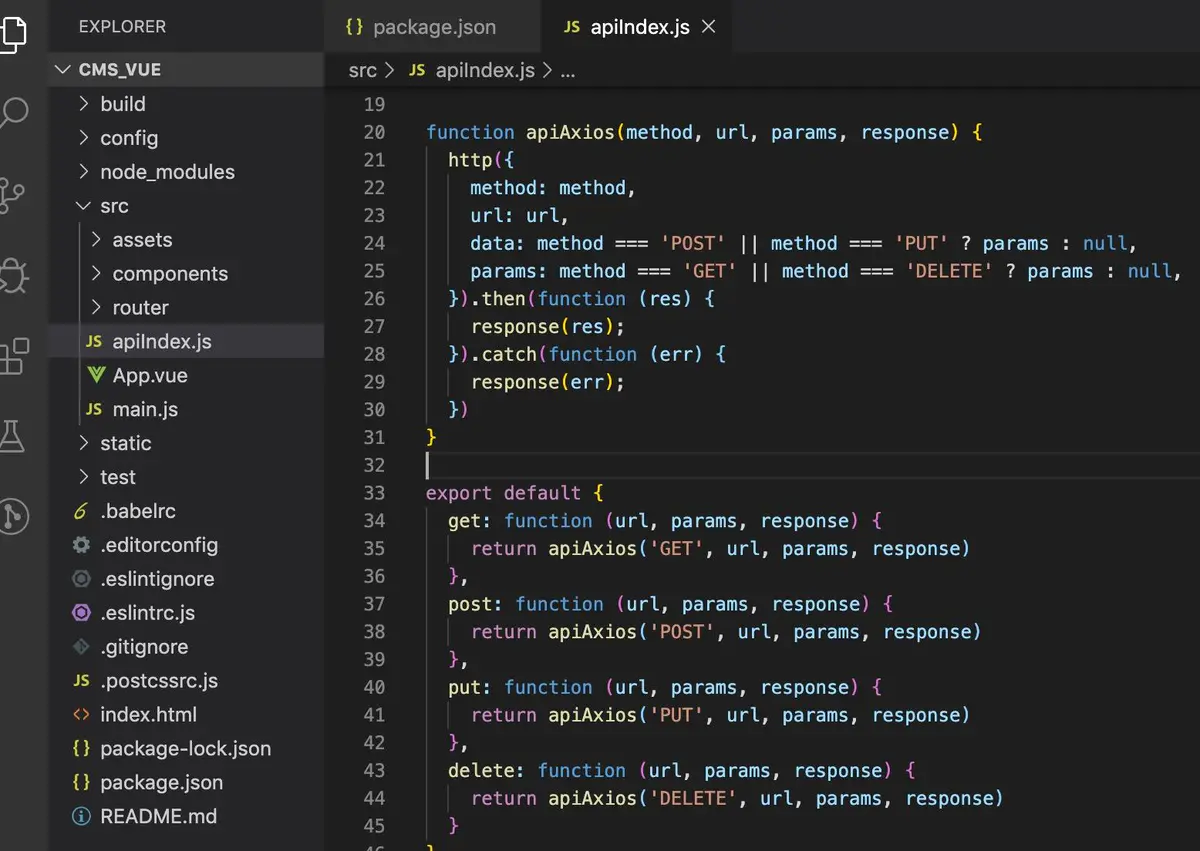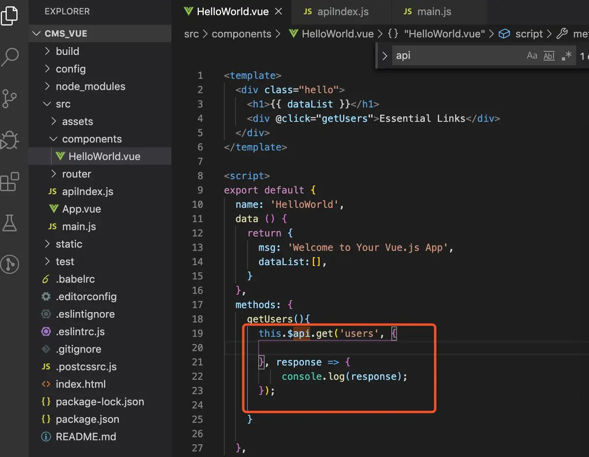 四:下面我们来说下,vue中如何调用后端接口(由于vue项目是http://localhost:8080/)express项目的api是(http://localhost:3000/)所以,会造成跨域问题,这里我们用cors解决跨域问题