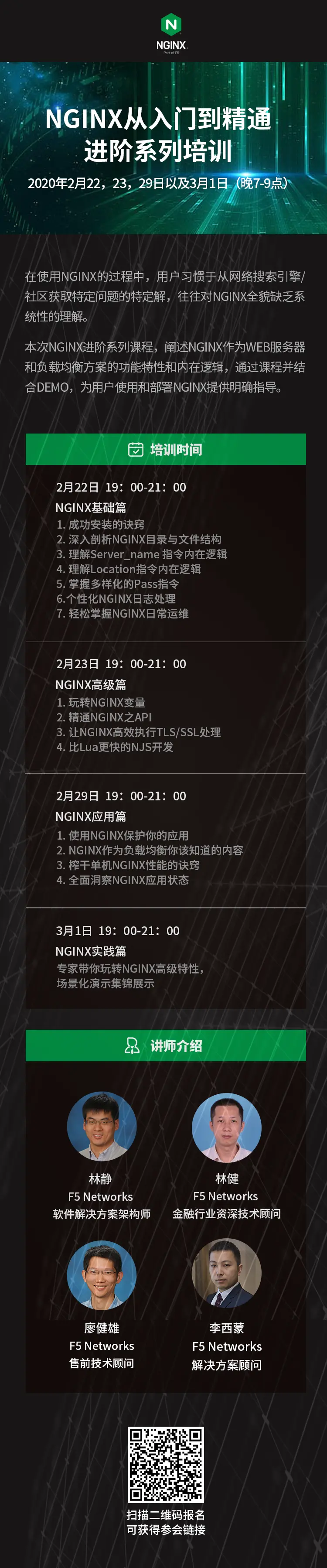 NGINX从入门到精通进阶系列培训 F5Networks 2020-02-21 252 阅读1分钟 在使用NGINX的过程中,用户习惯于从网络搜索引擎/社区获取特定问题的特定解,往往对Nginx全貌缺乏系统性的理解。 本次Nginx进阶系列课程,阐述NGINX作为WEB服务器和负载均衡方案的功能特性和内在逻辑,通过课程并结合demo,为用户使用和部署NGINX提供明确指导。