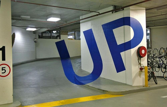 在墨尔本的一家停车场内,这些out和up的指示标记都是用视觉错位展示的,非常的有创意。