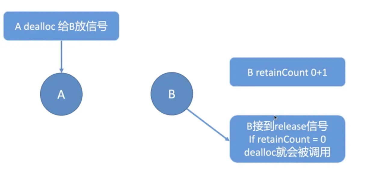 析构函数dealloc,给B发送release信息。这时候A不再持有B,则B的引用计数-1,如果B的引用计数为0,则B就调用自己的析构函数去释放自己