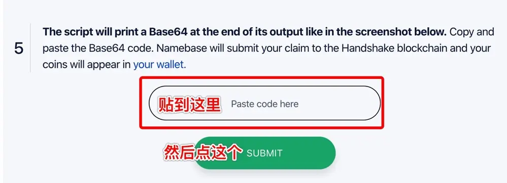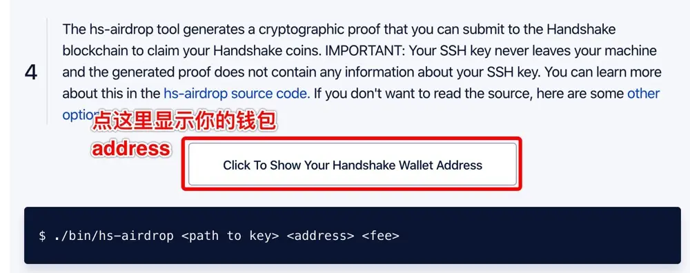 第四步,点击网页上的 Step 4 的 Click To Show Your Handshake Wallet Address,得到你的 HNS 币钱包 address: