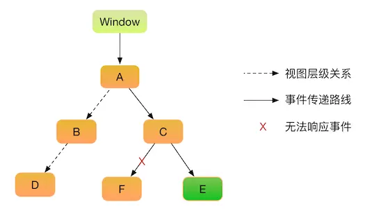 1.UIWindow将事件传递给其子视图A 2.A判断自身能响应该事件,继续将事件传递给C(因为视图C比视图B后添加,因此优先传给C)。 3.C判断自身能响应事件,继续将事件传递给F(同理F比E后添加)。 4.F判断自身不能响应事件,C又将事件传递给E。 5.E判断自身能响应事件,同时E已经没有子视图,因此最终E就是最佳响应者。