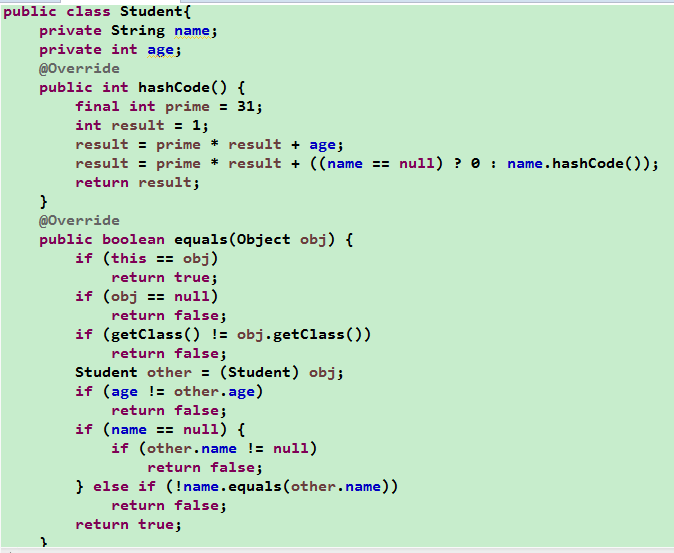 上图展示了Student类的重写后的equals方法和hashcode方法,建议大家用eclipse自动生成,尽量不要自己敲因为很有可能会出错。