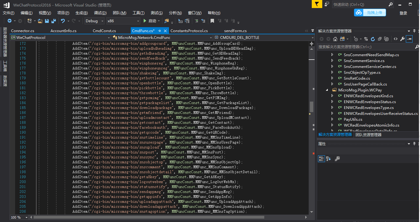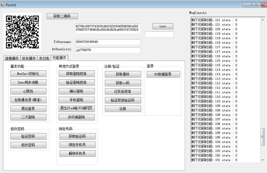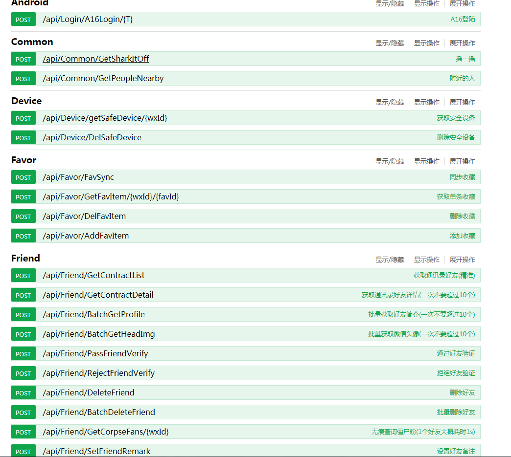 getLoginQRCode (获取登录二维码) CheckLoginQRCode(检测扫码状态) ManualAuth(扫码登录) ManualAuth(62数据登录) ManualAuth(账号密码登录) newverifypasswd(验证密码) GetQRCode(获取个人或群二维码) F2FQrcode(取收款码) SendNewMsg(发送文本消息) NewInit(获取微信会话列表和信息) NewSyncEcode(同步未读信息和好友) SnsSync(同步朋友圈) SnsUserPage(获取指定人朋友圈) SnsTimeLine(取朋友圈首页) GetSnsObjectOp(操作朋友圈) LbsLBSFind(附近的人) GetContactLabelList(获取标签分组) InitContact(获取通讯录) SearchContact(搜索微信号手机号QQ号) UploadMsgImg(发送图片) UploadVoice(发送音频) TenPay(获取钱包信息) TenPay(确认收款) TenPay(生成自定义金额二维码) VerifyUser(V1V2操作,关注公众号,添加好友) OpLogDelUser(删除好友) ShakeReport(摇一摇) FavSync(同步收藏) GetFavItem(获取单条收藏) DelFavItem(删除收藏) addFavItem(添加收藏) logOut(退出登录) AddContactLabel(添加标签) ModifyContactLabelList(修改标签列表) DelContactLabel(删除标签) SnsUpload(上传朋友圈图片) SendAppMsg(发送APP消息) setChatRoomAnnouncement(发布群公告) GetMsgImg(接收消息图片) ExtDeviceLoginConfirmGet(扫码登录) UploadMsgImgCDN(发送CDN图片) GetContact(获取详细资料) TenPay(创建转账) GetA8Key(不想说) CreateChatRoom(创建群) AddChatRoomMember(添加群成员) AddChatRoomMember(删除群成员) GetChatroomMemberDetail(取群成员详细) setChatRoomAnnouncement(修改群公告) GetQRCode(获取群二维码或个人二维码) NewInit(初始化第一次登录使用会返回微信列表和信息)
