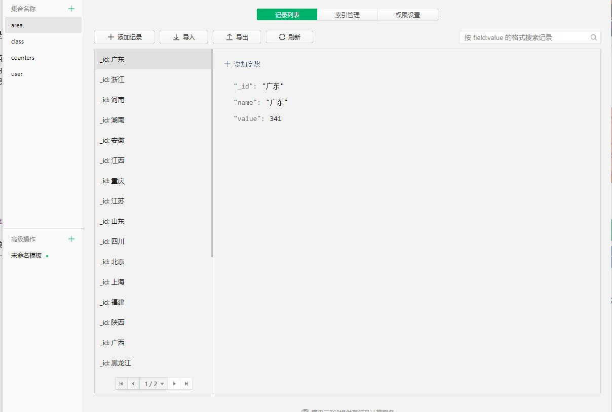 - 打开项目后进入云开发->数据库,创造三个表,分别是area,user,class,并分别导入项目json文件夹下的json文件,area表单导入名字带area的json文件,以此类推。(init代表仅仅初始化表单,没有数据。没有init的就是有数据的,假设你想看效果就导入名字不带init的)